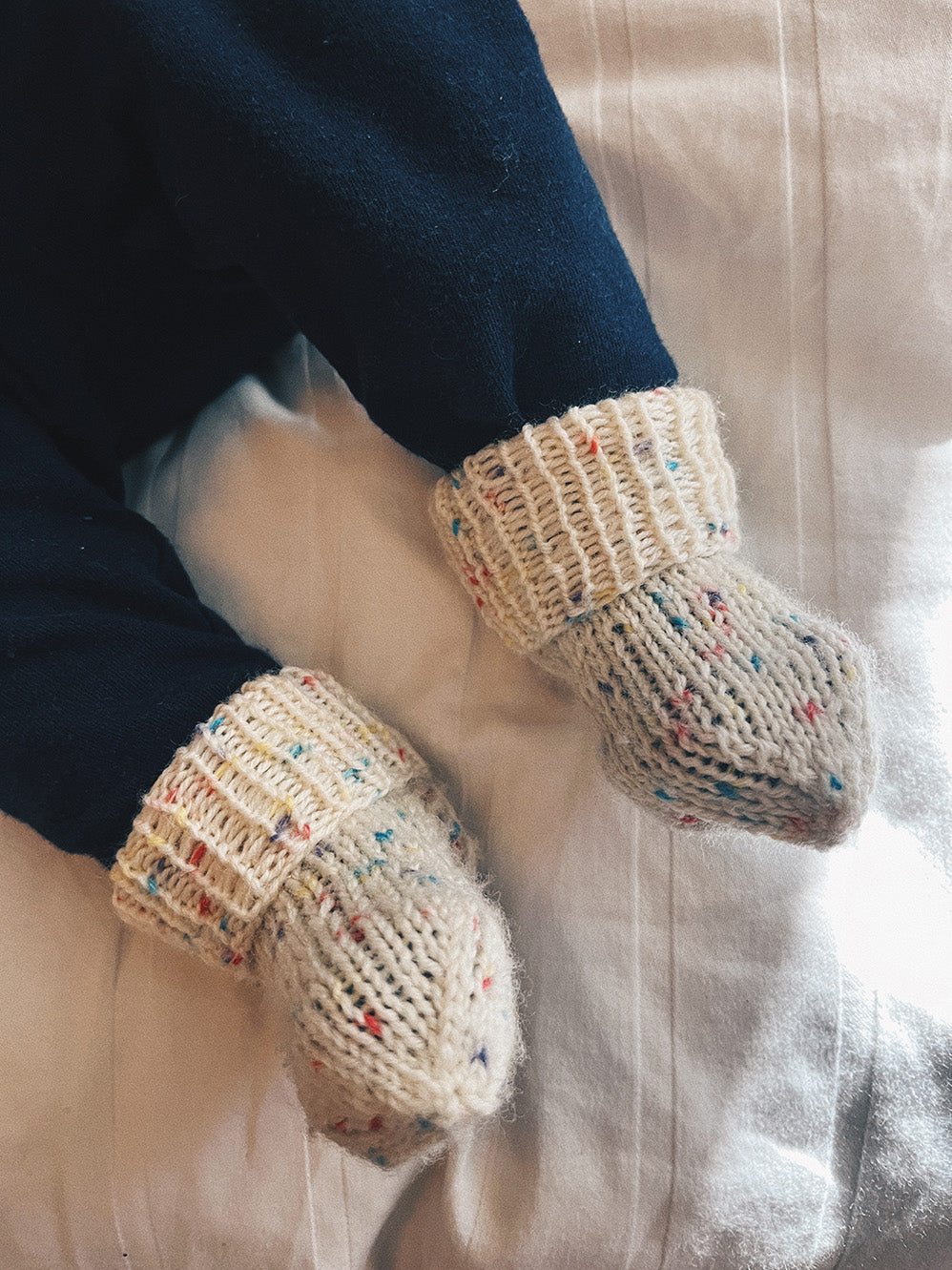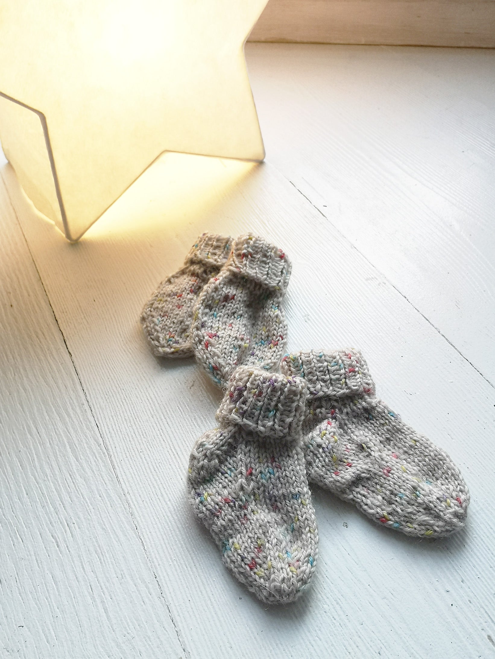 Håndstrikket babysokker og votter i myk babyull