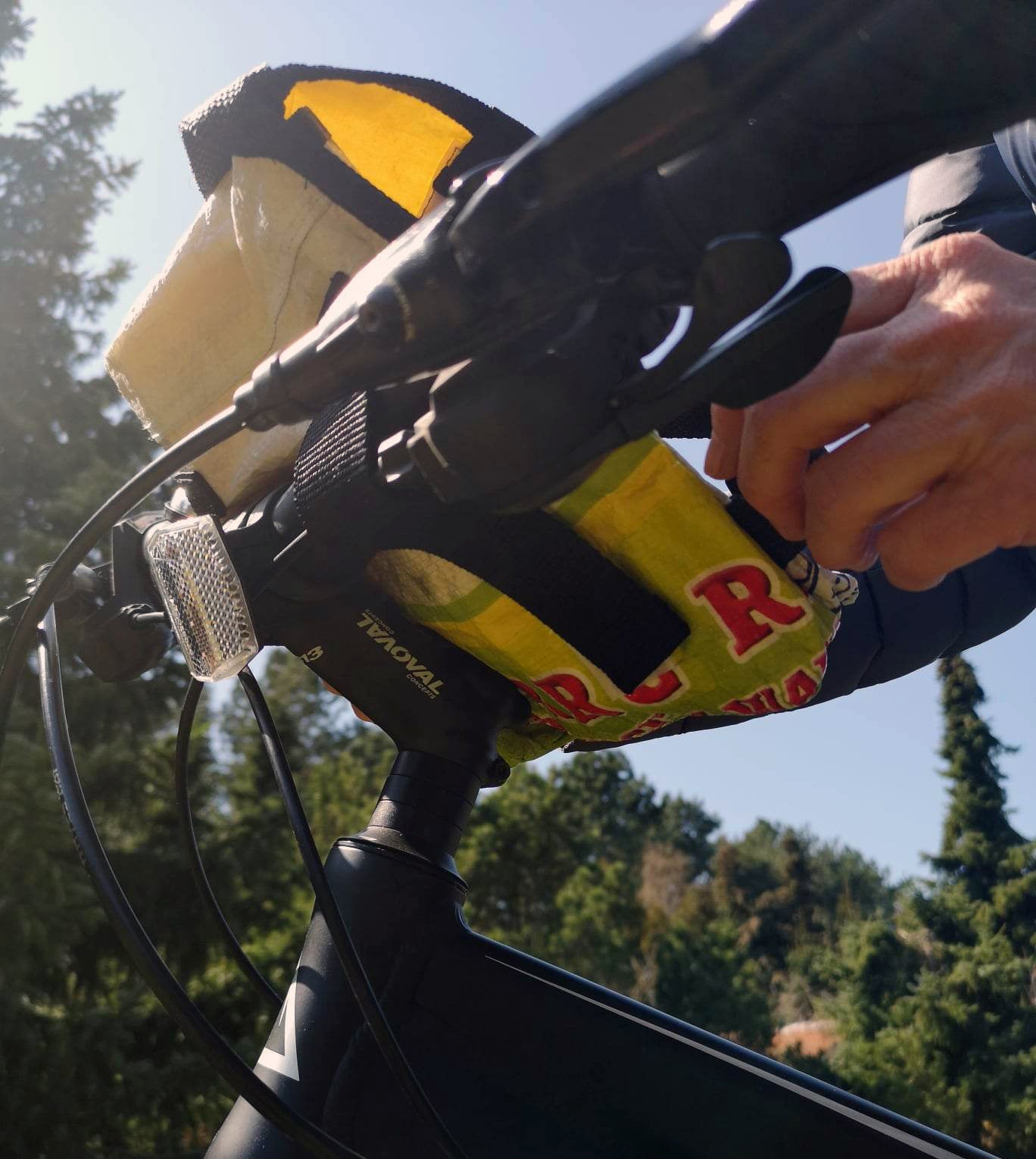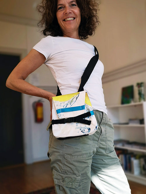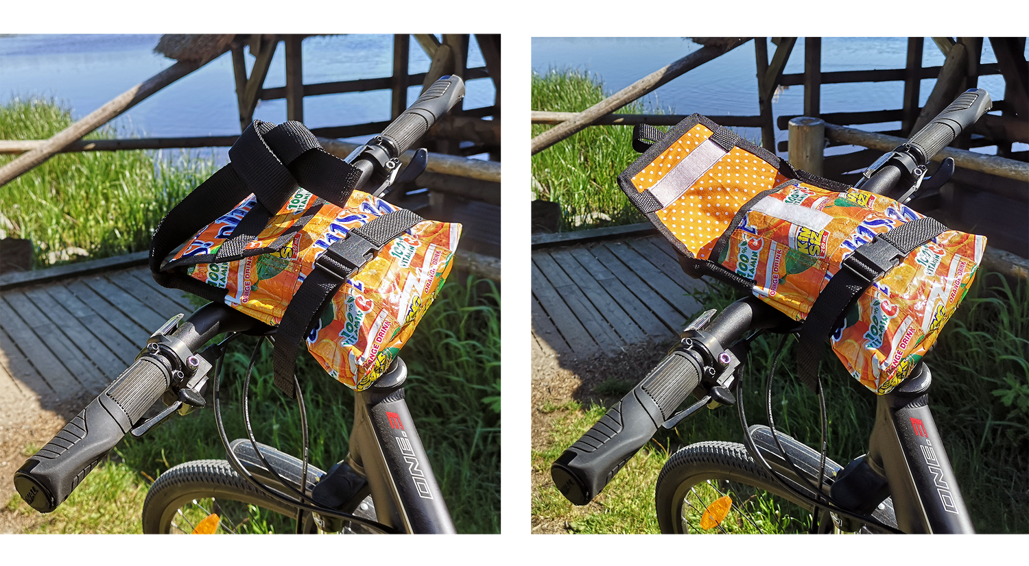 Denne sykkelvesken er perfekt å ha på styret pluss bruke som skulderveske. Den er laget av gjenbruksmaterialer, og er et bærekraftig valg. Vesken er enkel å feste og ta av, og derfor praktisk når du er på farten.